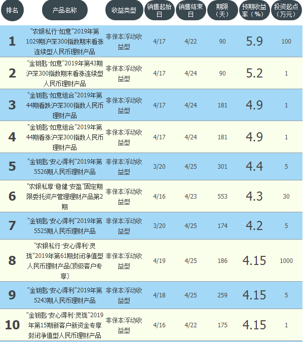 今日农业银行在售银行理财产品收益最高为“农银私行·如意2019年第1029期沪深300指数期末看涨连续型人民币理财产品”,该款产品理财期限为90天,最高预期收益为5.9%,投资起点为100万元,该款产品4月17日-4月22日面向全国发售。