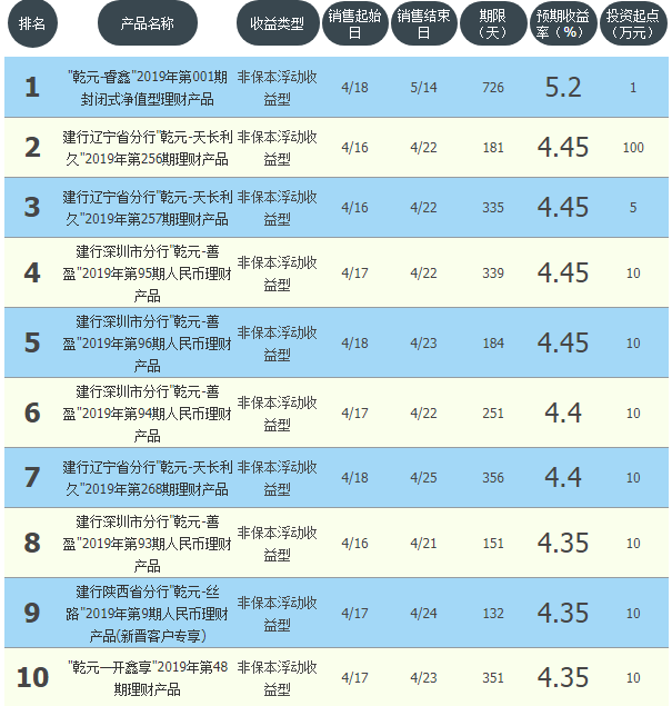 今日建设银行在售银行理财产品收益最高为“乾元-睿鑫2019年第001期封闭式净值型理财产品”,该款产品理财期限为726天,最高预期收益为5.2%,投资起点为1万元,该款产品4月18日-4月14日面向全国发售。