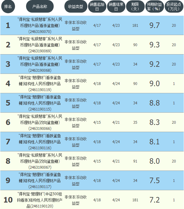 今日交通银行在售银行理财产品收益最高为“得利宝·私银慧享系列人民币理财产品(看涨鲨鱼鳍)(2463190070)”,该款产品理财期限为181天,最高预期收益为9.7%,投资起点为20万元,该款产品4月17日-4月23日面向全国发售。