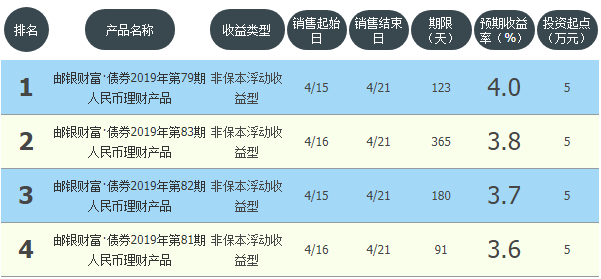 今日邮政储蓄银行在售银行理财产品收益最高为“邮银财富·债券2019年第79期人民币理财产品”,该款产品理财期限为123天,最高预期收益为4.0%,投资起点为5万元,该款产品4月15日-4月21日面向全国发售。