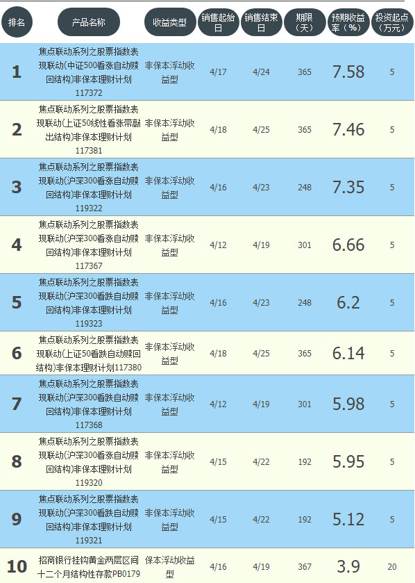 今日招商银行在售银行理财产品收益最高为“焦点联动系列股票指数表现联动(中证500看涨自动赎回结构)非保本理财计划117372”,该款产品理财期限为365天,最高预期收益为7.58%,投资起点为5万元,该款产品4月17日-4月24日面向全国发售。