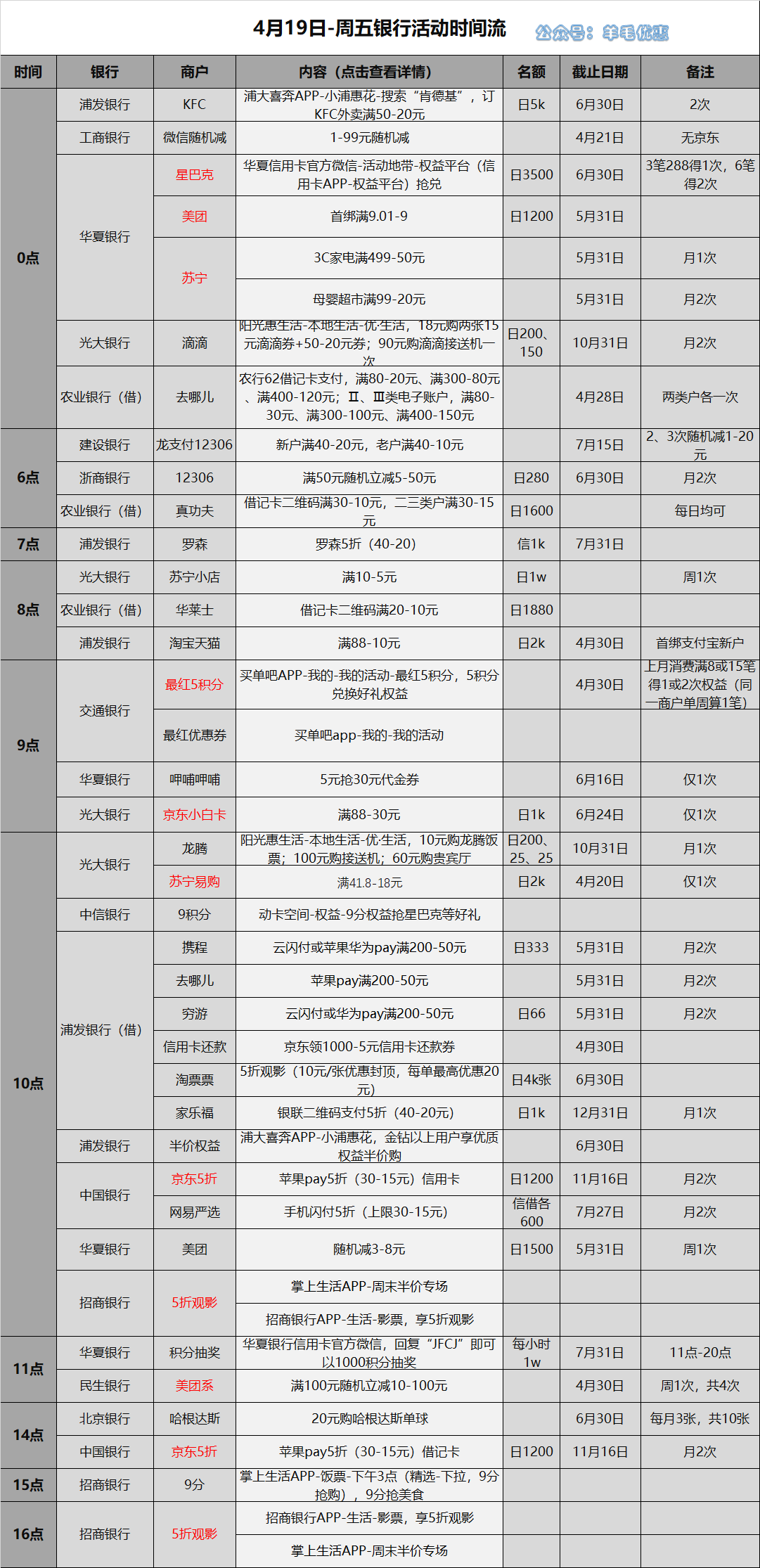 农行每周一品;中行京东5折;华夏苏宁、美团满减;建行双标卡天猫;交行最红星期五、5积分
