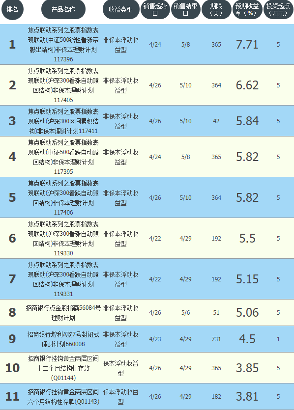 今日招商银行在售银行理财产品收益最高为“焦点联动系列股票指数表现联动(中证500线性看涨带敲出结构)非保本理财计划117396”,该款产品理财期限为365天,最高预期收益为7.71%,投资起点为5万元,该款产品4月24日-4月8日面向全国发售。
