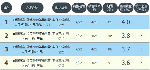 今日邮政储蓄银行在售银行理财产品收益最高为“邮银财富·债券2019年第84期人民币理财产品(新客专享)”,该款产品理财期限为123天,最高预期收益为4.0%,投资起点为5万元,该款产品4月22日-4月28日面向全国发售。