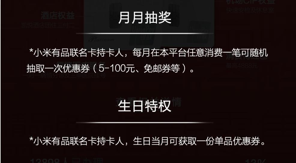除了可以“盘”的卡面外,这张联名信用卡的权益也很厚道,核卡后60天内任意消费一笔最高可获赠120元小米有品无门槛优惠券,还有月月抽奖、生日月单品优惠等特权。