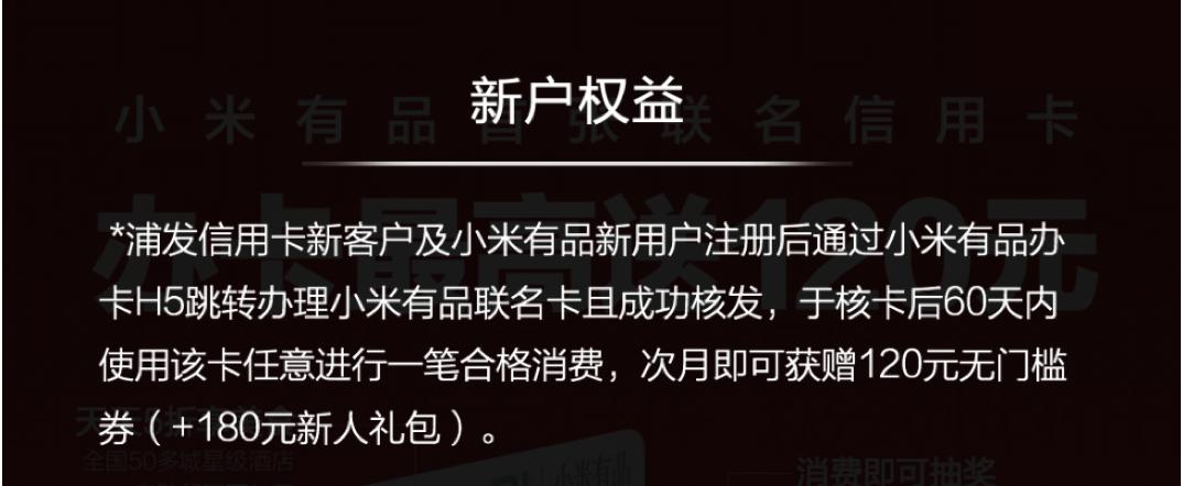 如申请人为浦发、小米有品的双新用户,可获赠120元优惠券;浦发新用户、小米有品老用户可获80元优惠券;小米有品新用户、浦发老用户可获20元优惠券。