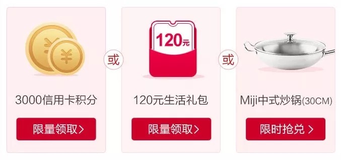 达标条件:任意消费3天,每天满7000元,以下礼品三选一,包括3000信用卡积分、120元生活礼包(含20元话费券、50元电影券、50元商城券)、MiJi中式炒锅。