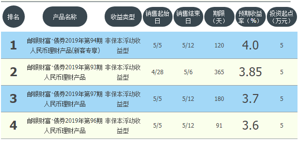 今日邮政储蓄银行在售银行理财产品收益最高为“邮银财富·债券2019年第94期人民币理财产品(新客专享)”,该款产品理财期限为120天,最高预期收益为4.0%,投资起点为5万元,该款产品5月5日-5月12日面向全国发售。