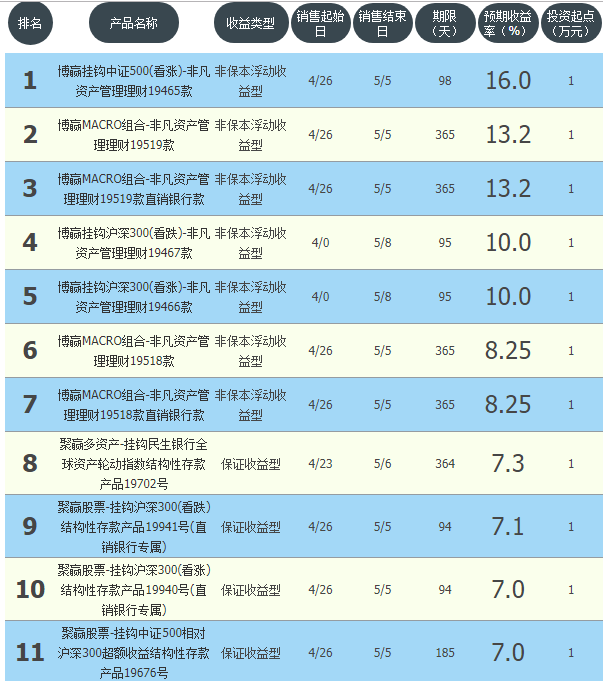 今日民生银行在售银行理财产品收益最高为“博赢挂钩中证500(看涨)-非凡资产管理理财19465款”,该款产品理财期限为98天,最高预期收益为16.0%,投资起点为1万元,该款产品5月26日-5月5日面向全国发售。