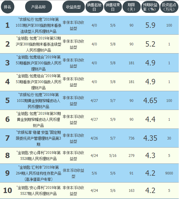 今日农业银行在售银行理财产品收益最高为“农银私行·如意2019年第1033期沪深300指数期末看涨连续型人民币理财产品”,该款产品理财期限为90天,最高预期收益为5.9%,投资起点为100万元,该款产品5月0日-5月6日面向全国发售。
