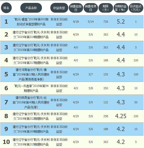 今日建设银行在售银行理财产品收益最高为“乾元-睿鑫2019年第001期封闭式净值型理财产品”,该款产品理财期限为726天,最高预期收益为5.2%,投资起点为1万元,该款产品5月18日-5月14日面向全国发售。