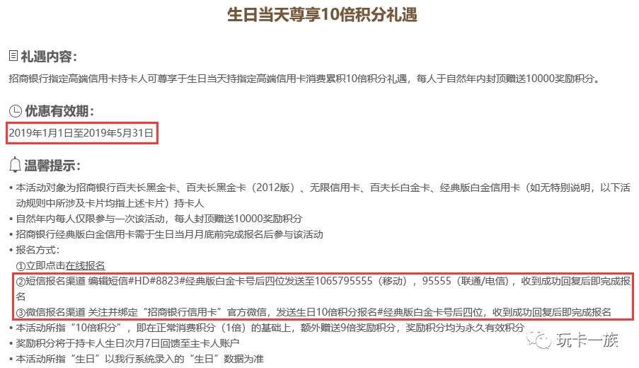 不过,招行高端卡持卡人生日10倍积分活动周期,依然停留在2019年5月31日,会不会再次引起大家的担忧呢,毕竟不续期的话,招行坑爹的积分政策(39元=1分,天量的“零星”不计积分商户,活动积分都给非永久积分,不可兑换年费),想要用10000积分兑换主卡年费,可能也是有困难的?