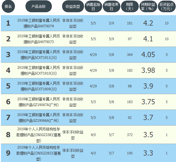 今日工商银行在售银行理财产品收益最高为“工银财富专属人民币理财产品SHXT9074”,该款产品理财期限为181天,最高预期收益为4.2%,投资起点为10万元,该款产品5月5日-5月9日面向上海发售。
