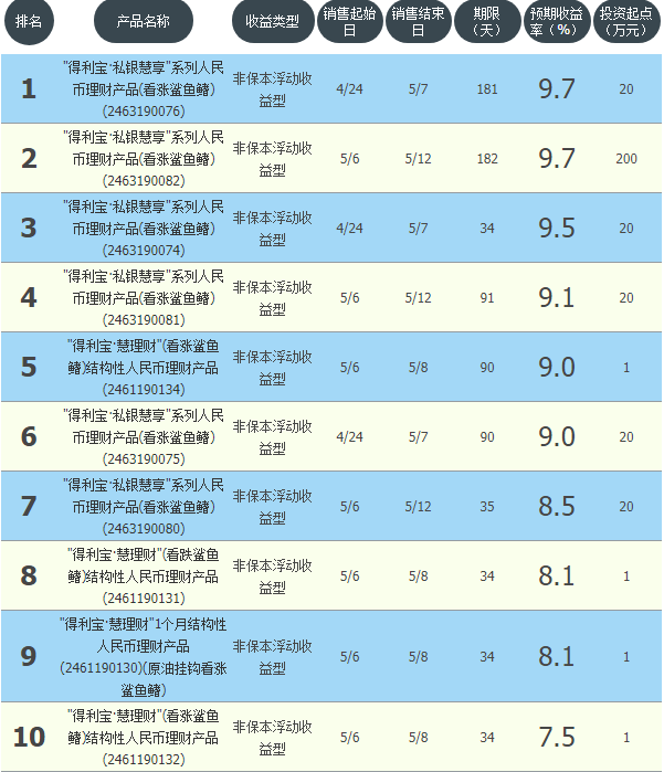 今日交通银行在售银行理财产品收益最高为“得利宝·私银慧享系列人民币理财产品(看涨鲨鱼鳍)(2463190076)”,该款产品理财期限为181天,最高预期收益为9.7%,投资起点为20万元,该款产品5月24日-5月7日面向全国发售。