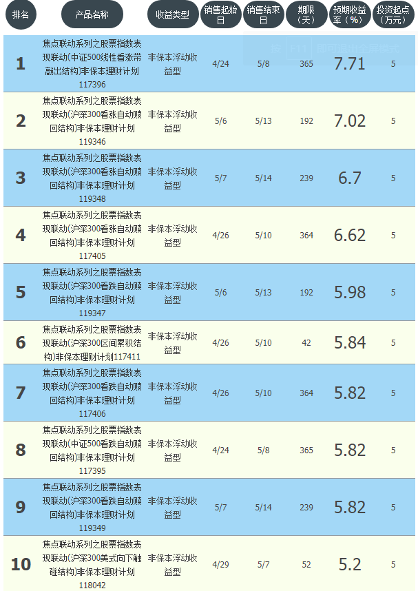 今日招商银行在售银行理财产品收益最高为“焦点联动系列股票指数表现联动(中证500线性看涨带敲出结构)非保本理财计划117396”,该款产品理财期限为365天,最高预期收益为7.71%,投资起点为5万元,该款产品5月24日-5月8日面向全国发售。