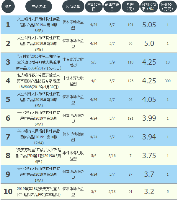 今日兴业银行在售银行理财产品收益最高为“兴业银行人民币结构性存款理财产品(2019年第16期6MB)”,该款产品理财期限为191天,最高预期收益为5.05%,投资起点为1万元,该款产品5月24日-5月7日面向全国发售。