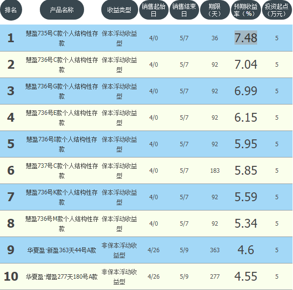 今日华夏银行在售银行理财产品收益最高为“慧盈735号C款个人结构性存款”,该款产品理财期限为36天,最高预期收益为7.48%,投资起点为5万元,该款产品5月0日-5月7日面向全国发售。