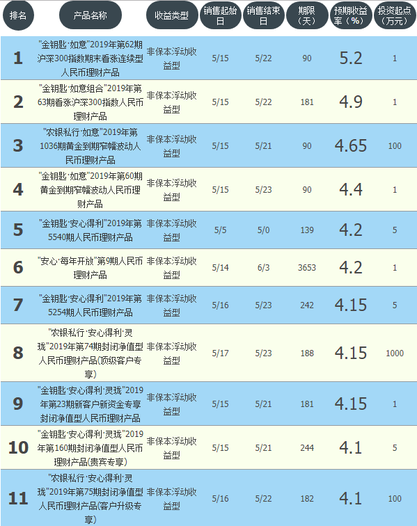 今日农业银行在售银行理财产品收益最高为“金钥匙·如意2019年第62期沪深300指数期末看涨连续型人民币理财产品”,该款产品理财期限为90天,最高预期收益为5.2%,投资起点为1万元,该款产品5月15日-5月22日面向全国发售。