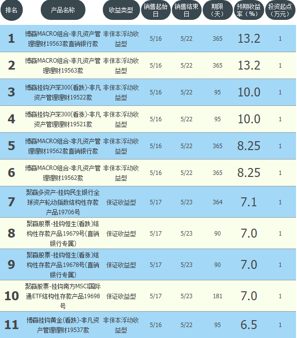 今日民生银行在售银行理财产品收益最高为“博赢MACRO组合-非凡资产管理理财19563款直销银行款”,该款产品理财期限为365天,最高预期收益为13.2%,投资起点为1万元,该款产品5月16日-5月22日面向全国发售。