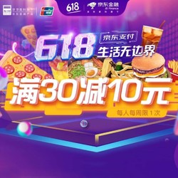 2019年5月20日-6月30日,用户在指定快餐、咖啡甜品商户使用京东闪付、京东APP或京东金融APP“码支付”完成支付,即有机会享受满30元立减10元优惠次,每日优惠名额有限,先到先得。名额使用情况可通过直达链接查看。每人每周限享受1次。