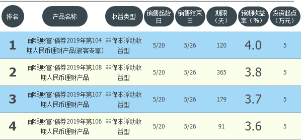 今日邮政储蓄银行在售银行理财产品收益最高为“邮银财富·债券2019年第104期人民币理财产品(新客专享)”,该款产品理财期限为120天,最高预期收益为4.0%,投资起点为5万元,该款产品5月20日-5月26日面向全国发售。