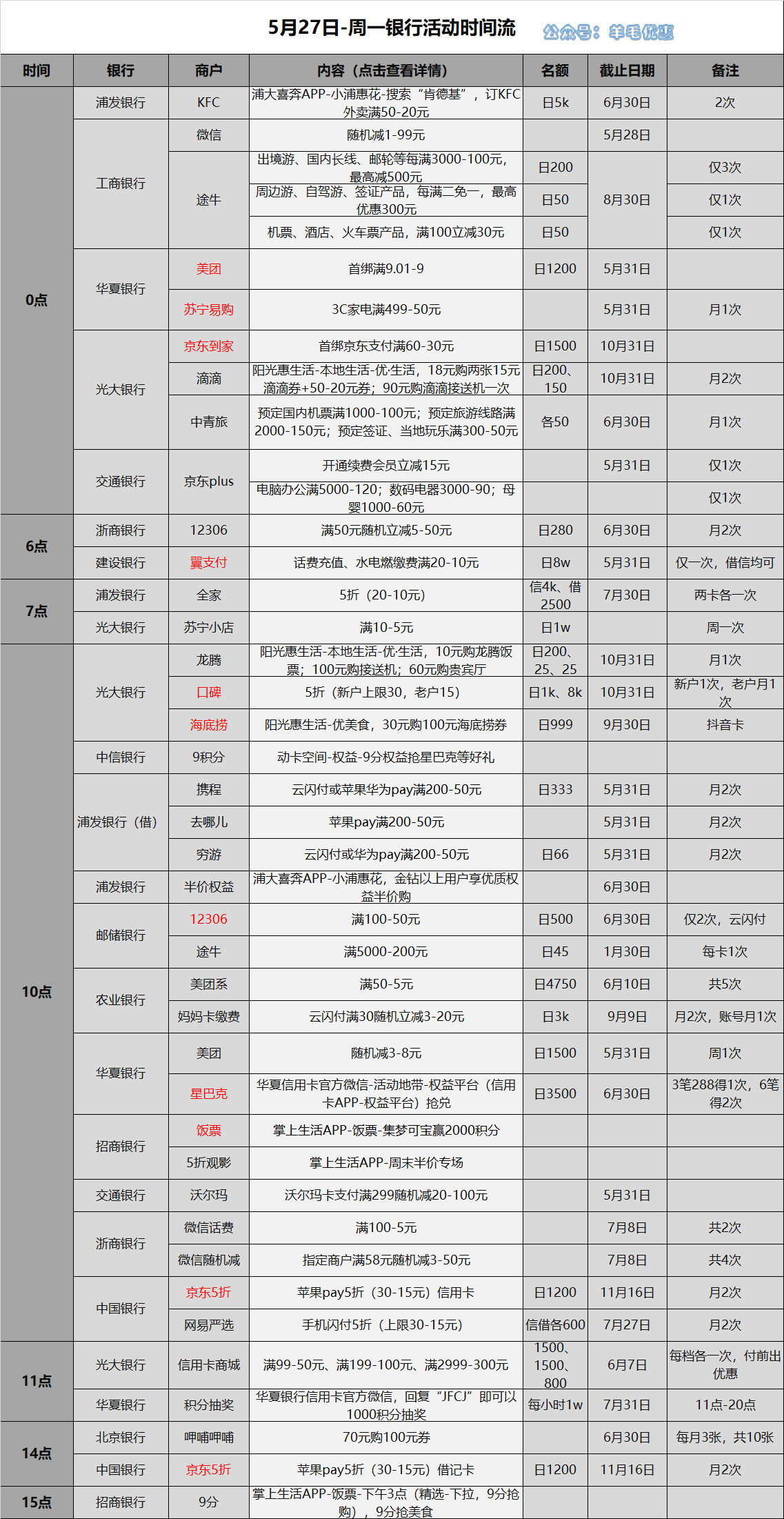 光大银行x飞常准联名卡:非常准APP购买火车票,使用光大飞常准联名卡支付,满31-30元(月2次,共6次,共24000个名额);购买机票使用光大飞常准白金卡支付,满500-150元、如果是飞常准超级会员,金卡白金卡均可满500-150元(共2000个名额)