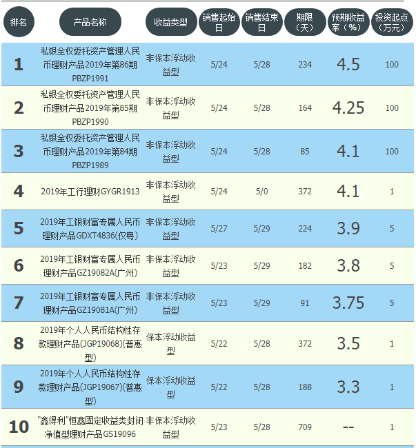 今日工商银行在售银行理财产品收益最高为“私银全权委托资产管理人民币理财产品2019年第86期PBZP1991”,该款产品理财期限为234天,最高预期收益为4.5%,投资起点为100万元,该款产品5月24日-5月28日面向全国发售。