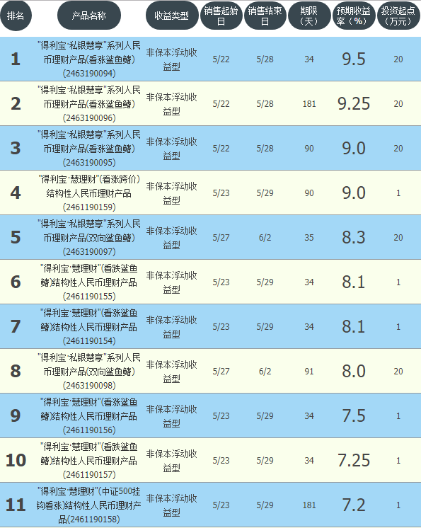 今日交通银行在售银行理财产品收益最高为“得利宝·私银慧享系列人民币理财产品(看涨鲨鱼鳍)(2463190094)”,该款产品理财期限为34天,最高预期收益为9.5%,投资起点为20万元,该款产品5月22日-5月28日面向全国发售。