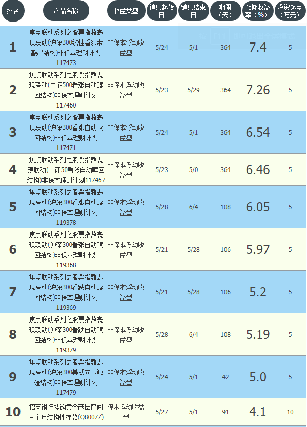 今日招商银行在售银行理财产品收益最高为“焦点联动系列股票指数表现联动(沪深300线性看涨带敲出结构)非保本理财计划117473”,该款产品理财期限为364天,最高预期收益为7.4%,投资起点为5万元,该款产品5月24日-5月1日面向全国发售。