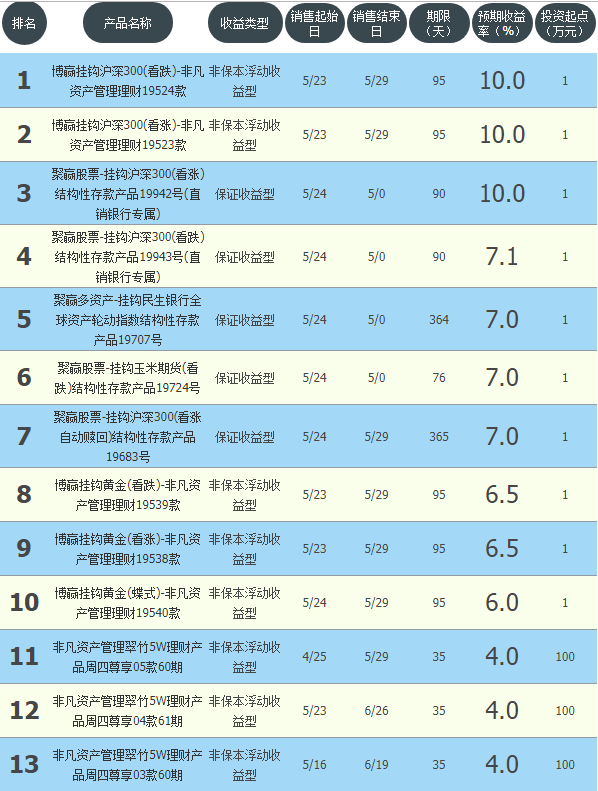 今日华夏银行在售银行理财产品收益最高为“慧盈747号C款个人结构性存款”,该款产品理财期限为36天,最高预期收益为7.47%,投资起点为1万元,该款产品5月22日-5月28日面向全国发售。