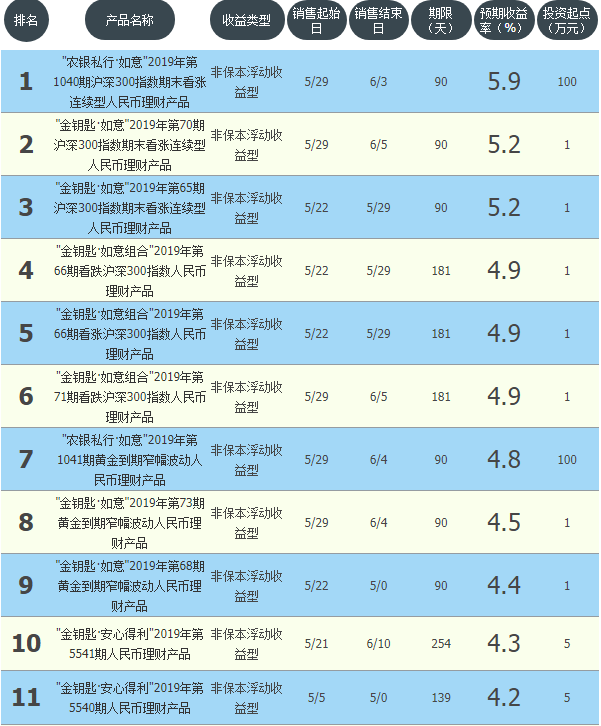 今日农业银行在售银行理财产品收益最高为“农银私行·如意2019年第1040期沪深300指数期末看涨连续型人民币理财产品”,该款产品理财期限为90天,最高预期收益为5.9%,投资起点为100万元,该款产品5月29日-5月3日面向全国发售。