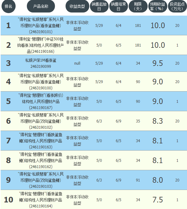今日交通银行在售银行理财产品收益最高为“得利宝·私银慧享系列人民币理财产品(看涨鲨鱼鳍)(2463190101)”,该款产品理财期限为181天,最高预期收益为10.0%,投资起点为20万元,该款产品6月29日-6月4日面向全国发售。