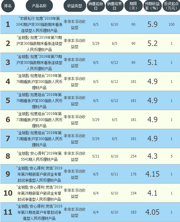 今日农业银行在售银行理财产品收益最高为“农银私行·如意2019年第1042期沪深300指数期末看涨连续型人民币理财产品”,该款产品理财期限为90天,最高预期收益为5.9%,投资起点为100万元,该款产品6月5日-6月10日面向全国发售。