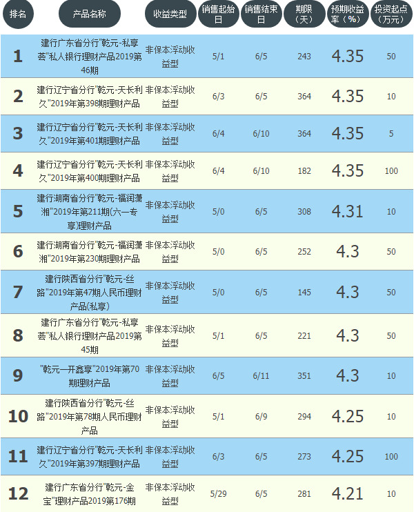 今日建设银行在售银行理财产品收益最高为“建行广东省分行乾元-私享荟私人银行理财产品2019第46期”,该款产品理财期限为243天,最高预期收益为4.35%,投资起点为50万元,该款产品6月1日-6月5日面向全国发售。