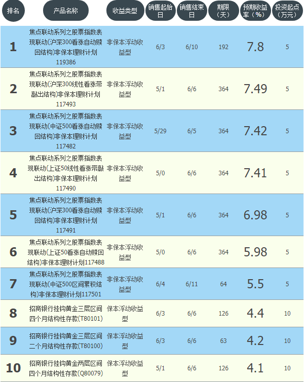 今日招商银行在售银行理财产品收益最高为“焦点联动系列股票指数表现联动(沪深300看涨自动赎回结构)非保本理财计划119386”,该款产品理财期限为192天,最高预期收益为7.8%,投资起点为5万元,该款产品6月3日-6月10日面向全国发售。