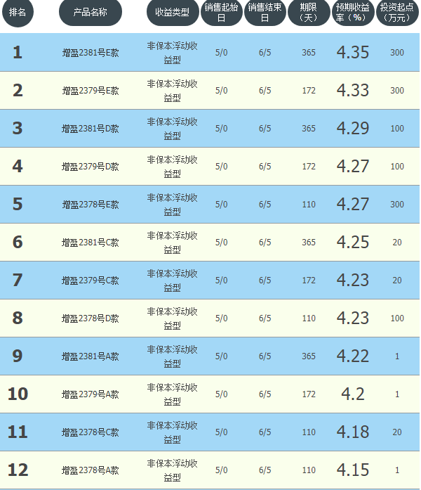 今日华夏银行在售银行理财产品收益最高为“增盈2381号E款”,该款产品理财期限为365天,最高预期收益为4.35%,投资起点为300万元,该款产品6月0日-6月5日面向全国发售。