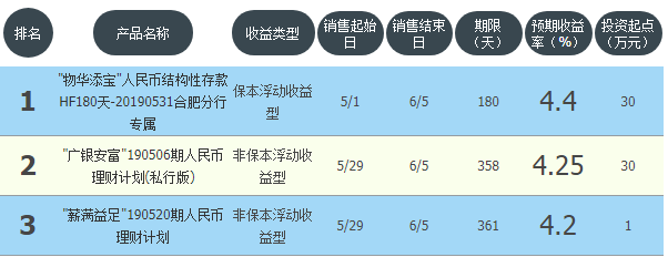 今日广发银行在售银行理财产品收益最高为“物华添宝人民币结构性存款HF180天-20190531合肥分行专属”,该款产品理财期限为180天,最高预期收益为4.4%,投资起点为30万元,该款产品6月1日-6月5日面向合肥发售。