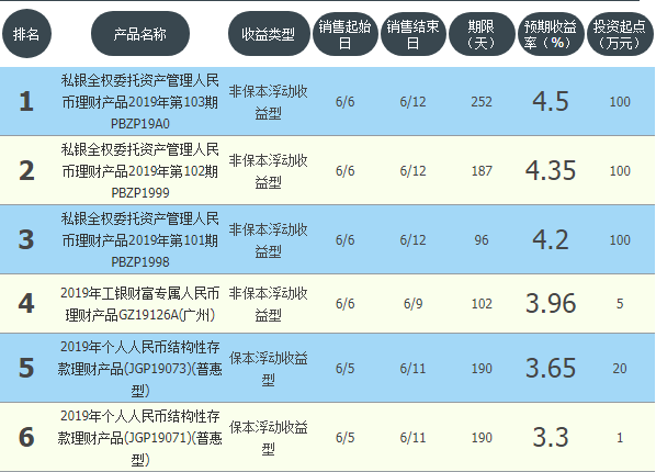 今日工商银行在售银行理财产品收益最高为“私银全权委托资产管理人民币理财产品2019年第103期PBZP19A0”,该款产品理财期限为252天,最高预期收益为4.5%,投资起点为100万元,该款产品6月6日-6月12日面向全国发售。