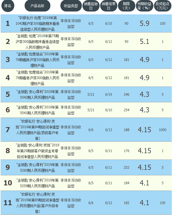 今日农业银行在售银行理财产品收益最高为“农银私行·如意2019年第1042期沪深300指数期末看涨连续型人民币理财产品”,该款产品理财期限为90天,最高预期收益为5.9%,投资起点为100万元,该款产品6月5日-6月10日面向全国发售。