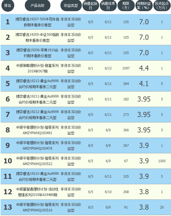 今日中国银行在售银行理财产品收益最高为“搏弈睿选19207-500半导体指数期末看涨价差型”,该款产品理财期限为105天,最高预期收益为7.0%,投资起点为1万元,该款产品6月5日-6月11日面向全国发售。