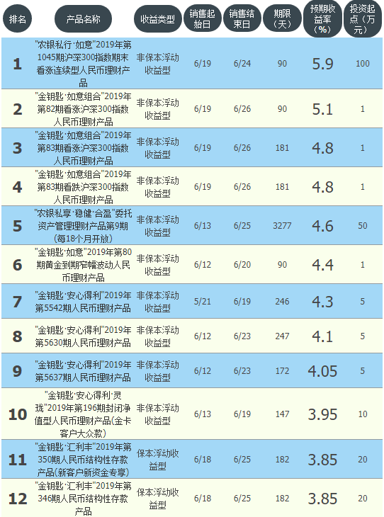 今日农业银行在售银行理财产品收益最高为“农银私行·如意2019年第1045期沪深300指数期末看涨连续型人民币理财产品”,该款产品理财期限为90天,最高预期收益为5.9%,投资起点为100万元,该款产品6月19日-6月24日面向全国发售。