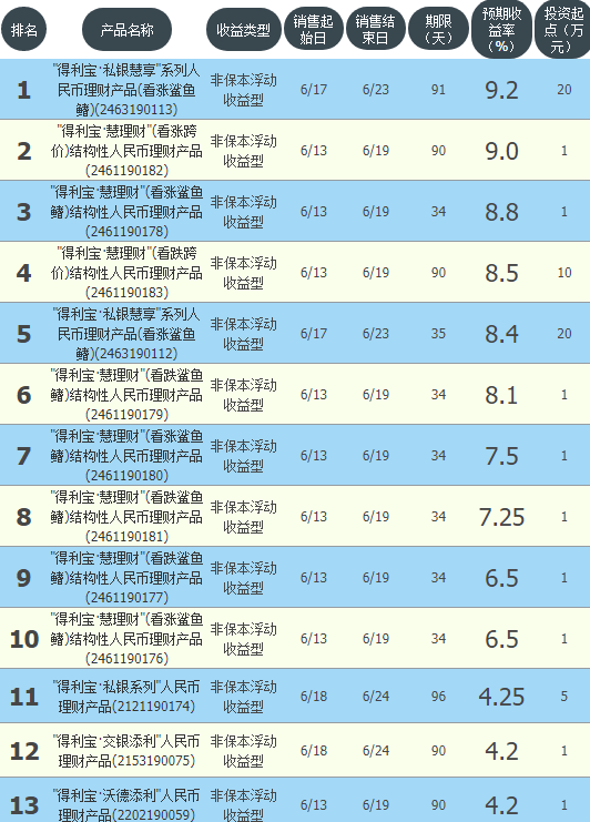今日交通银行在售银行理财产品收益最高为“得利宝·私银慧享系列人民币理财产品(看涨鲨鱼鳍)(2463190113)”,该款产品理财期限为91天,最高预期收益为9.2%,投资起点为20万元,该款产品6月17日-6月23日面向全国发售。