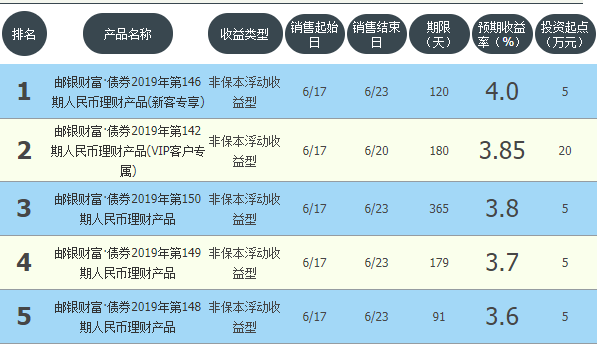 今日邮政储蓄银行在售银行理财产品收益最高为“邮银财富·债券2019年第146期人民币理财产品(新客专享)”,该款产品理财期限为120天,最高预期收益为4.0%,投资起点为5万元,该款产品6月17日-6月23日面向全国发售。