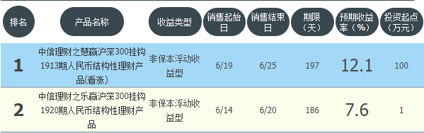 今日中信银行在售银行理财产品收益最高为“中信理财之慧赢沪深300挂钩1913期人民币结构性理财产品(看涨)”,该款产品理财期限为197天,最高预期收益为12.1%,投资起点为100万元,该款产品6月19日-6月25日面向全国发售。