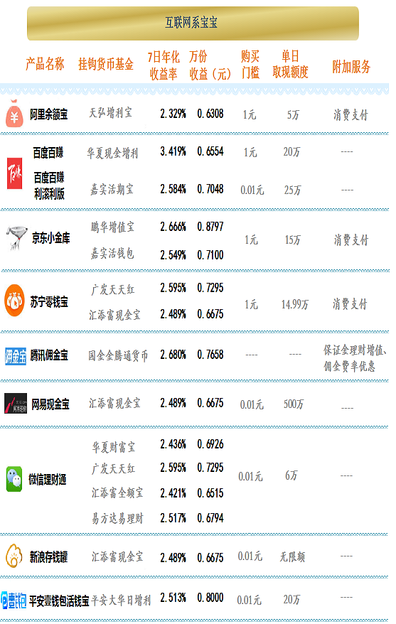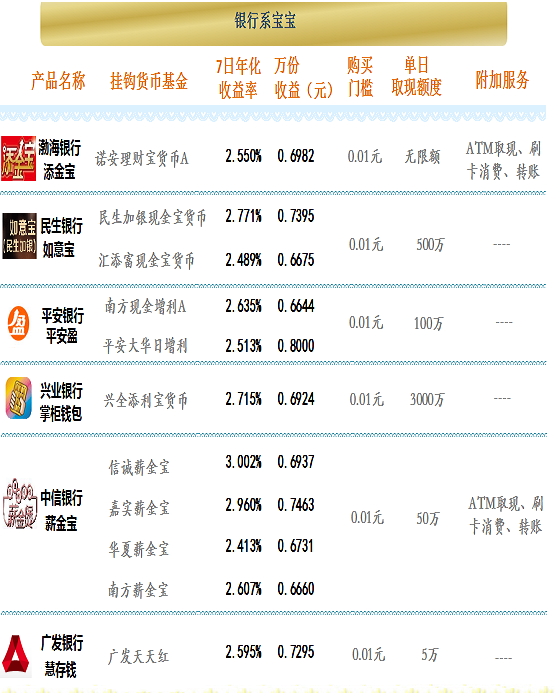 银行互联网理财收益前三名:第一,信诚薪金宝7日年化收益为3.002%;第二,嘉实薪金宝7日年化收益为2.960%;第三,民生加银现金宝货币7日年化收益为2.771%。