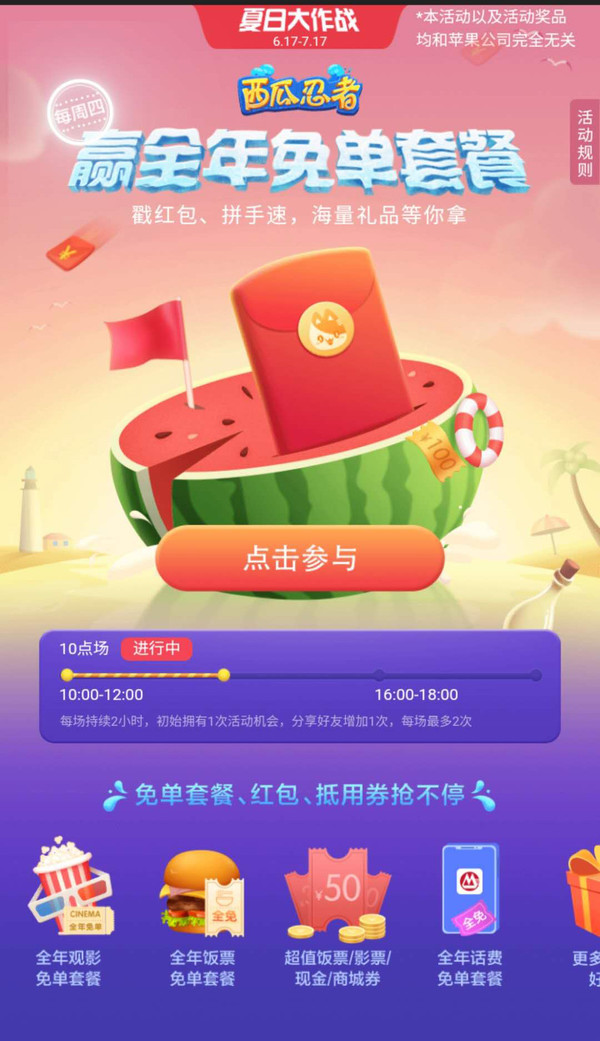 2019年6月17日-7月17日招商银行APP每周四上午10点、下午16点开启2场红包雨,每场持续2小时。可以在开启时间内参与戳红包。免单套餐、红包、抵用券抢不停,海量礼品等你拿!每场红包雨持续2小时,初始拥有1次活动机会,分享好友增加1次,每场最多2次。