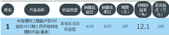 今日中信银行在售银行理财产品收益最高为“中信理财之慧赢沪深300挂钩1913期人民币结构性理财产品(看涨)”,该款产品理财期限为197天,最高预期收益为12.1%,投资起点为100万元,该款产品6月19日-6月25日面向全国发售。