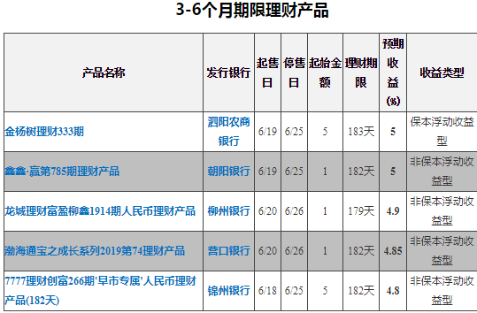 3-6个月银行理财中(非结构性)收益排名第一的为泗阳农商银行——金杨树理财333期人民币理财产品,预期最高收益率为5.0%。销售起始日:2019-06-19;销售截止日:2019-06-25;理财期限:183天;发行地区:江苏。