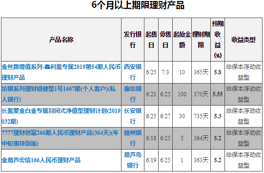 6个月及以上银行理财(非结构性)中收益排名第一的为西安银行——金丝路增值系列-鑫利盈专属2019第54期人民币理财产品,预期最高收益率为5.8%。销售起始日:2019-06-25;销售截止日:2019-07-03;理财期限:365天;发行地区:安康,宝鸡,汉中,商洛,铜川,渭南,西安,咸阳,延安,榆林。