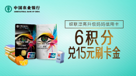 活动期间,持卡人使用农行银联漂亮升级妈妈信用卡主卡在指定活动商户通过农行指定机具消费(包括刷卡、插卡、挥卡、扫码付)单笔金额满60元可享“6积分兑15元刷卡金”优惠,在消费时直接享受15元立减,兑换刷卡金的6积分将在持卡人享受优惠的下一自然月统一从持卡人账户中扣除。单个银联漂亮升级妈妈卡主卡持卡人活动期间每个自然月在同一活动商户处最多可享受一次优惠,每个活动商户优惠名额有限,先到先得,用完即止。
